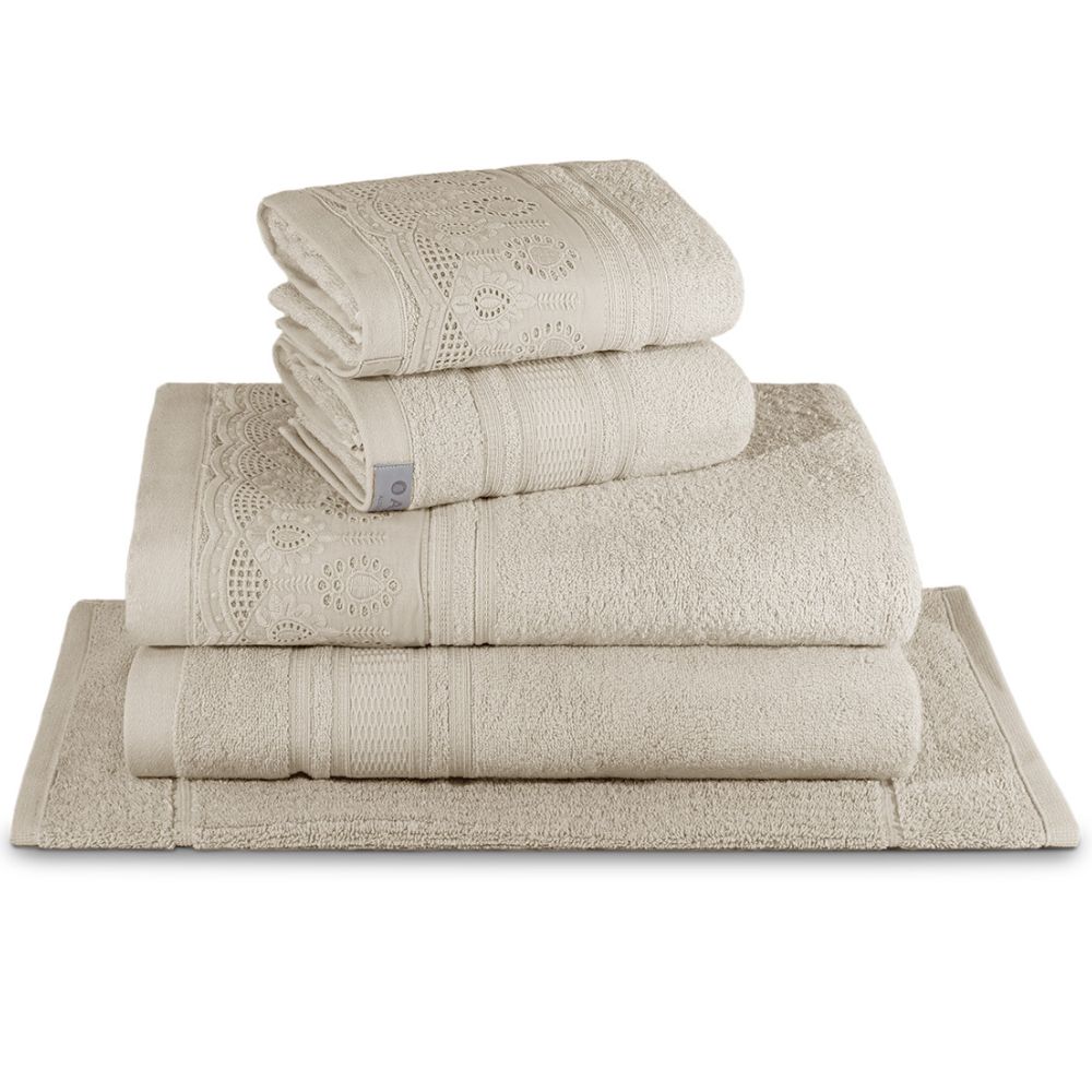 Este conjunto contém 5 peças: duas toalhas banhão, duas de rosto e um piso. Um par é decorado com renda e o outro possui um detalhe em relevo (Jacquard).