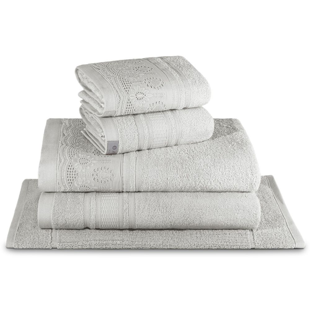 Este conjunto contém 5 peças: duas toalhas banhão, duas de rosto e um piso. Um par é decorado com renda e o outro possui um detalhe em relevo (Jacquard).