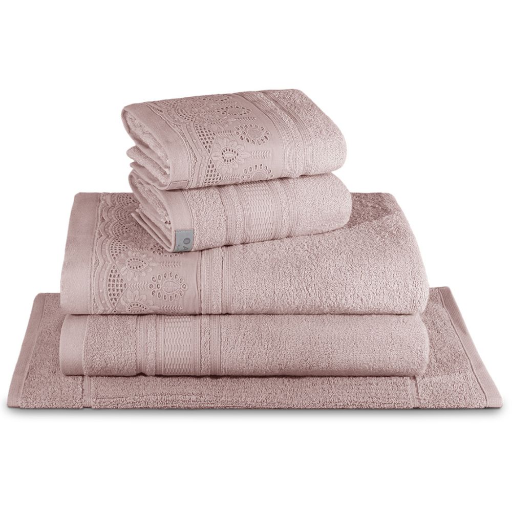 Este conjunto contém 5 peças: duas toalhas banhão, duas de rosto e um piso. Um par é decorado com renda e o outro possui um detalhe em relevo (Jacquard).